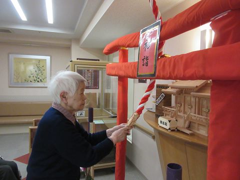 元旦より介護フロアに桃坂神社が登場!スタッフ手作りの立派な神社ができました。『立派やね~これ作ったの?』『怪我なく過ごせるようにお祈りしたよ♪』と皆さまに喜んでいただきました。お賽銭やおみくじも楽しまれ、笑顔あふれるお参りができました。