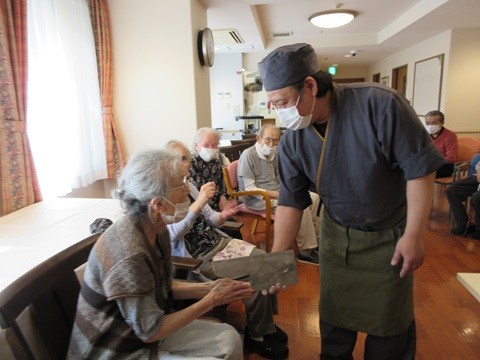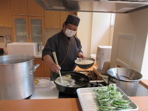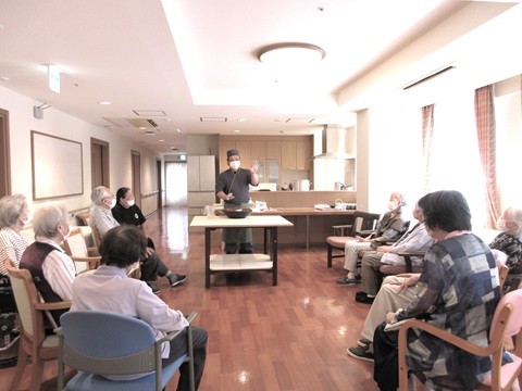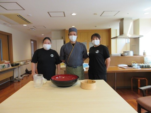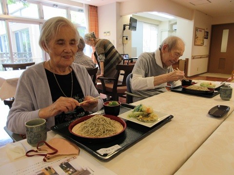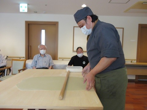 9月8日、ローズライフくずはで『手打ち蕎麦イベント』を開催しました。ホーム近隣の『崇祥』さんの店主をお招きし、蕎麦打ちの見学と『昼食会』を楽しんでいただきました。1階フロアのキッチンが本格的な厨房となり、揚げたての『天ぷら』まですべての工程をご覧になられました。実演を見学された後の『蕎麦』の味は格別だったようです。ホームでは、こうした五感を刺激していただける食の楽しみのイベントも行っております。