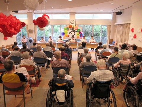 9月15日、ローズライフくずはで『敬老会イベント』を開催しました。ボランティアの『友弦流 大正琴 枚方』さまをお招きし大正琴の演奏と合唱を楽しまれました。たくさんのご入居者さまにご参加いただき、長寿のお祝いをさせていただくことができました。今年はホームに100歳を越えるお元気なご入居者さまが3名おられ、皆さまの目標となっています。