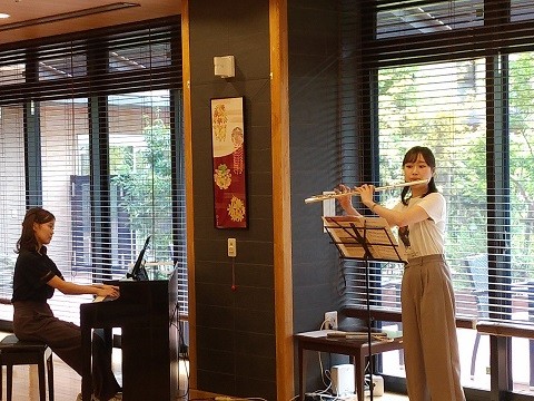 今回はフルートとピアノのコンサートです。徳永碧様と谷口百花様のAOI Duo(アオイデュオ)にお越しいただき、メヌエットやチャルダッシュ、中島みゆきさんの糸などを優しいフルートとピアノの音色でゆっくりと楽しむことができました。