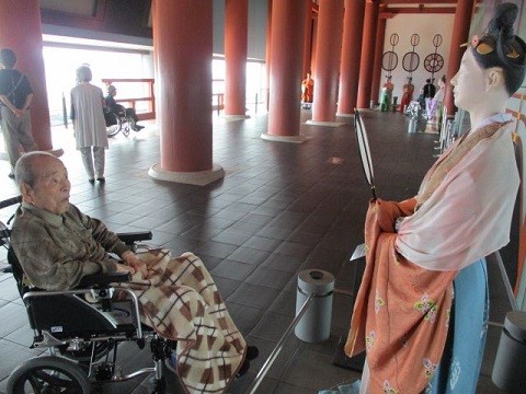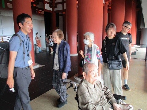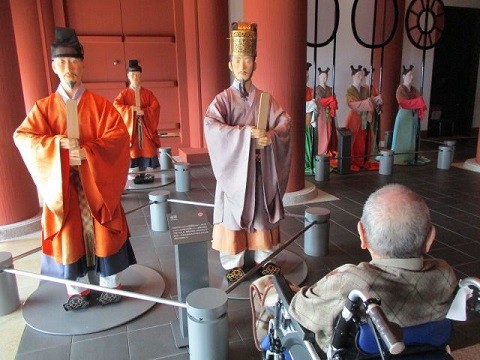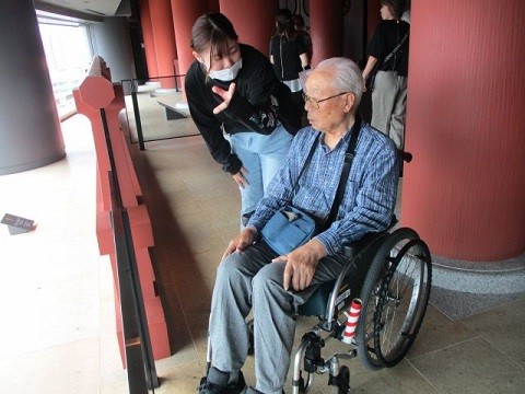介護タクシーと施設車に分かれてご乗車いただき『大阪歴史博物館』に向けて出発!『大阪歴史博物館』ではご家族さまと自由に散策していただき、『奈良時代の原寸大に復元された大極殿』や『江戸時代の文楽人形』『大正昭和の心斎橋筋や道頓堀を再現したレトロな街並み』など様々な展示を鑑賞いたしました。