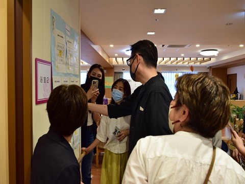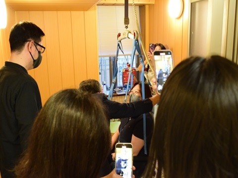 館内見学時には、介護用リフトの実演体験などもさせていただきました。また、幅広くご入居者さまのアクティビティや日常生活について関心を寄せていただき、お互いの介護に関わる社会課題を共有したり、文化の違いに驚いたりする場面もありました。