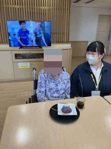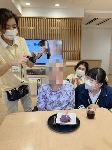 お誕生日をお迎えになったご入居者さまには何もお知らせしていませんでしたので、突然のサプライズに少し驚かれたご様子でしたが、勢いよくろうそくを吹き消され、何度も「ありがとう」と仰ってくださいました。