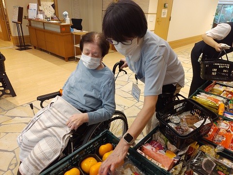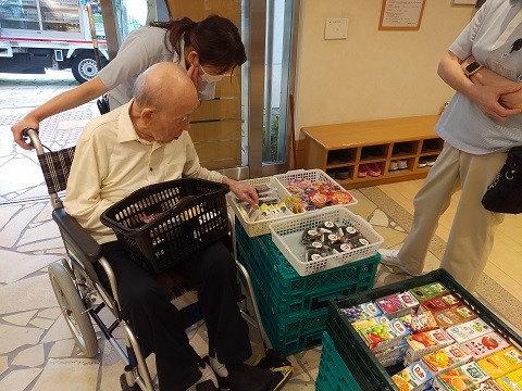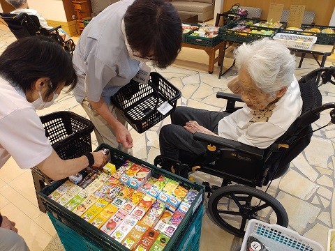 毎週金曜日の午後にKOHYO豊中緑丘店の方に来ていただき、ご入居者さまに買い物を楽しんでいただいてます♪美味しそうな『フルーツ』『和菓子』『洋菓子』『ジュース』『おにぎり』等々沢山の商品が並んでいて、皆さま時間をかけて好きな商品を選ばれています☆