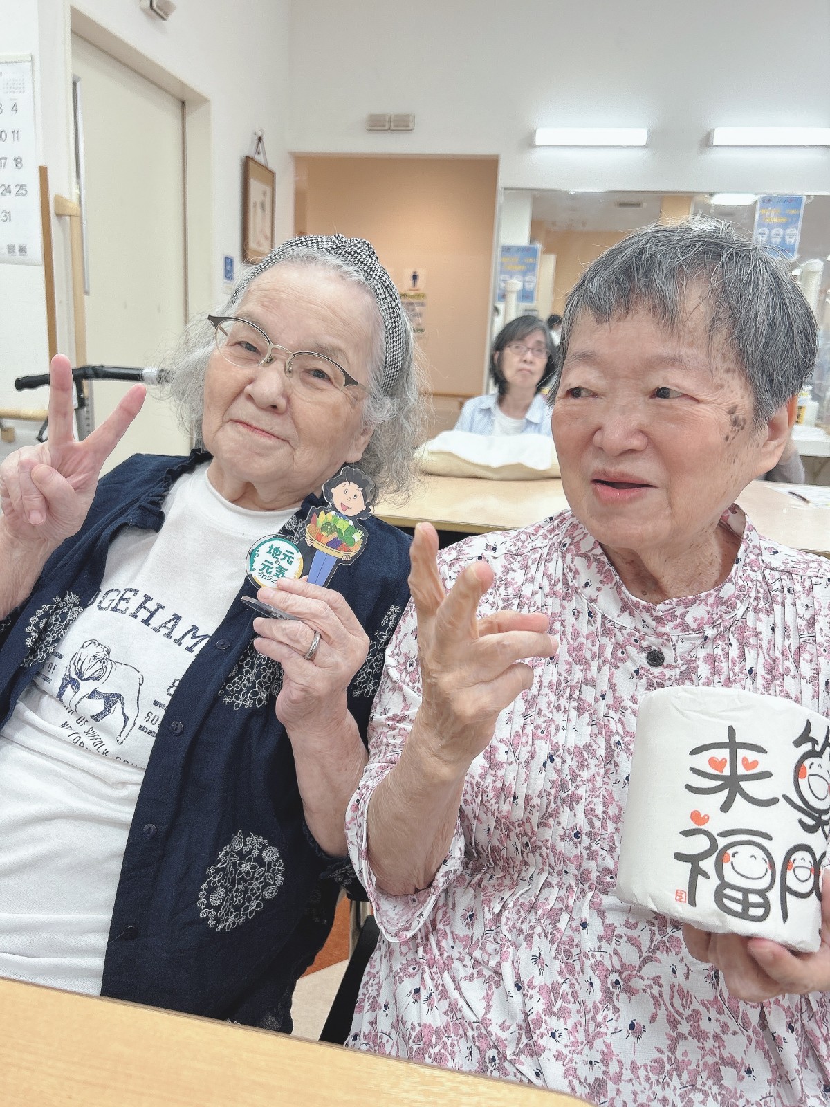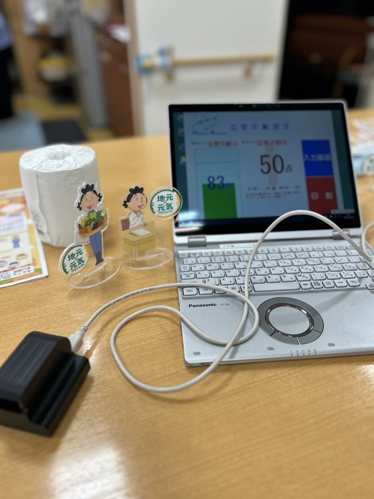 『明治安田生命』の方にお越しいただき、測定専用の機械に指をかざすだけで血管年齢や普段どの位お野菜が摂れているかを測っていただきました。測定後は今後の生活に必要なアドバイスなどしてくださり、測定を待っておられるご利用者さまには脳トレのプリントを配ってくださりと、皆さま大変喜んでいただきました。記念品として笑門福来のトイレットペーパーをプレゼントでいただきました。