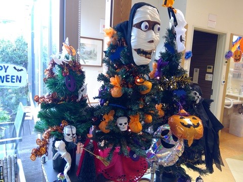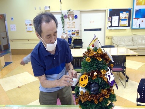 飾り付けは皆さま楽しんで飾り付けておられましたが、最後にツリーにお面をつけると「お化けが私の方を見ている」と顔を背けて過ごされるご利用者さまもおられ、位置を調整しながら皆さまに見て楽しんでいただいてます。
