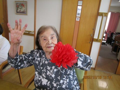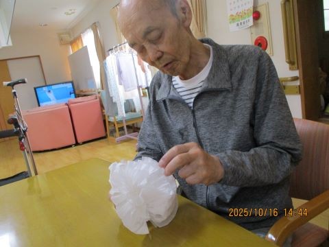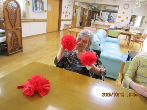「なかなか一枚づつ広げるの難しいね~」「わ~きれいな花ができました!」と皆さま丁寧に取り組んでいただけました♪運動会に向けて、盛り上がりを見せております♪当日が楽しみですね!!