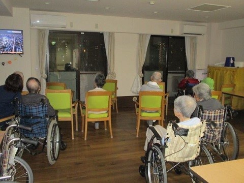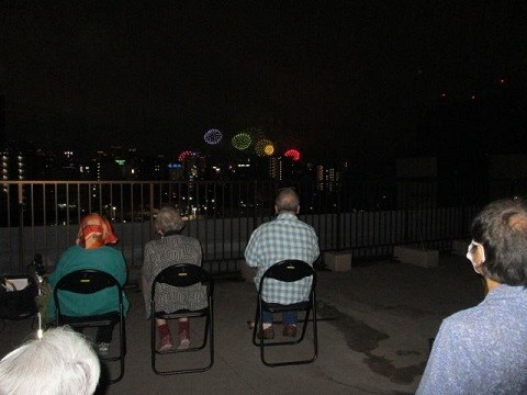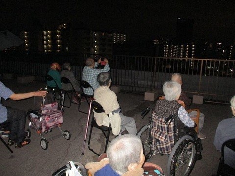 屋上と5階食堂フロアに会場を設け、ご入居者さまの体調に留意しながらご鑑賞いただきました。