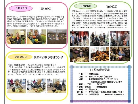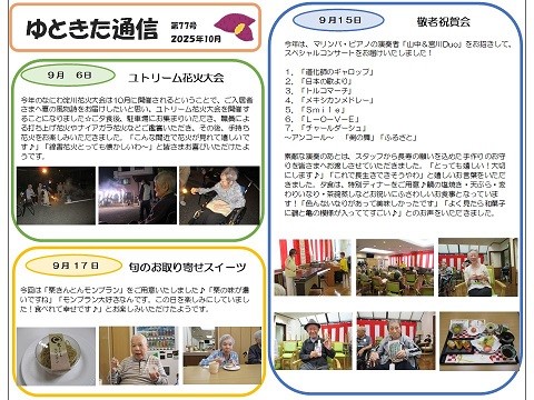 ご家族さま向けに毎月発行している『ゆときた通信』では、ホームでのイベントの様子や次月の予定を記載しております。