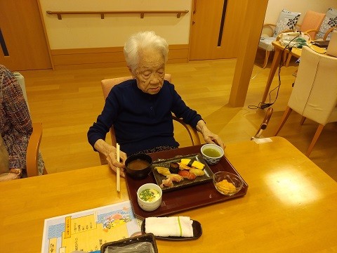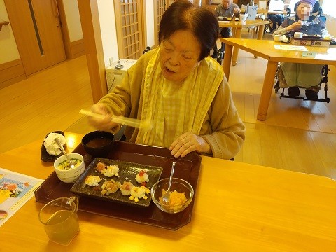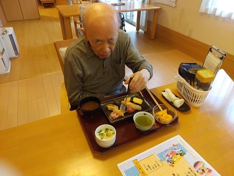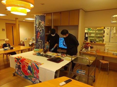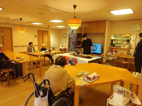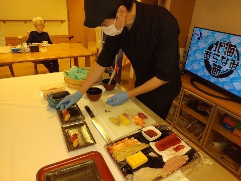 厨房スタッフがユニットにネタを持ち込み、ご入居者さまの前で握りました!