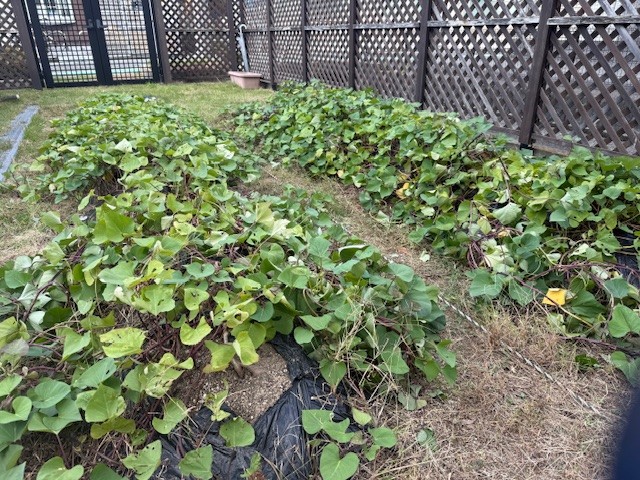駐車場の一角に作った芋畑に、今年は昨年より畝を高く作り、更なる大きなお芋の収穫への挑戦となりました。