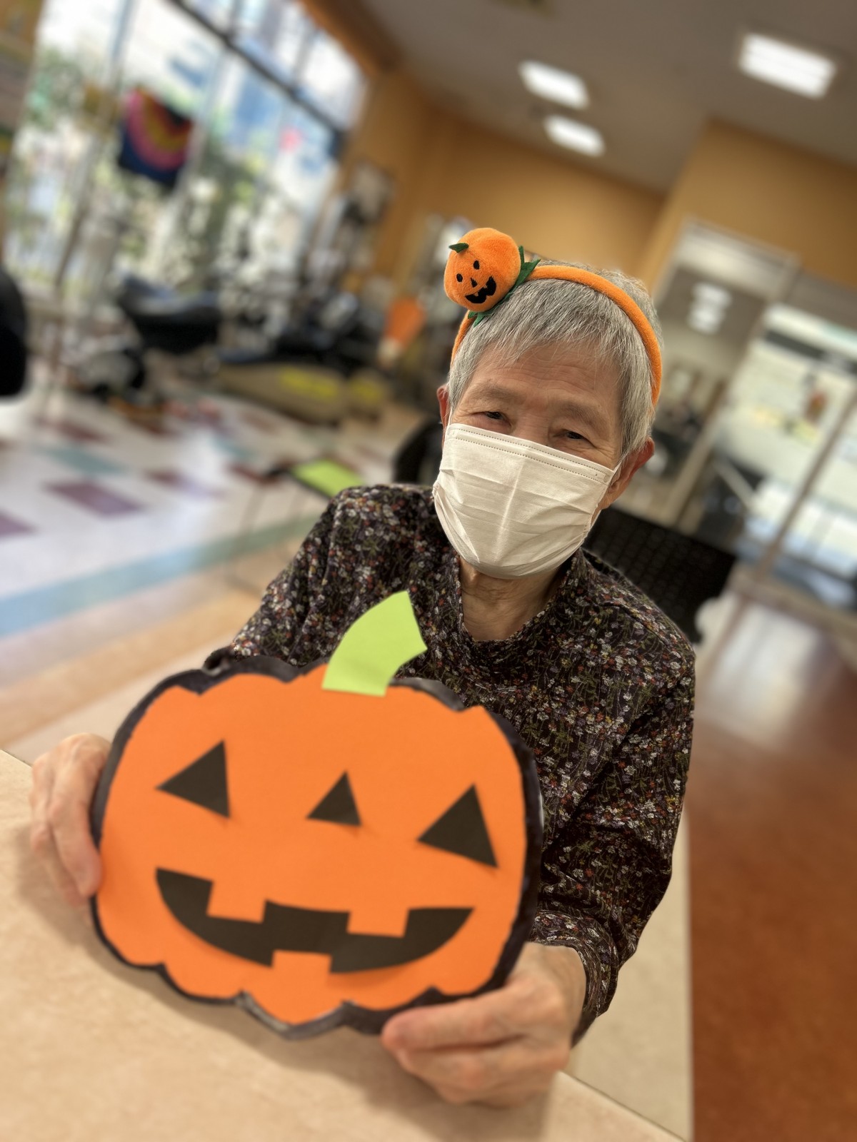 スタッフ皆で仮装をして、ご利用者さまにも帽子やカチューシャをつけてもらい、カボチャの福笑いゲームをしました。
