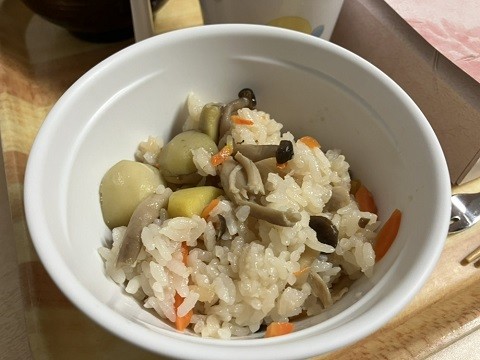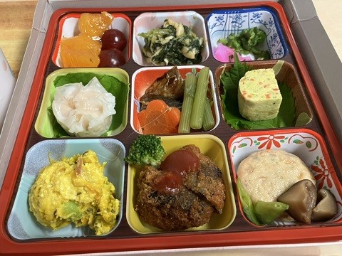 今回は秋の行楽弁当を作っていただきました。『炊き込みご飯』『煮物』『メンチカツ』『かぼちゃのサラダ』『シュウマイ』『焼き魚』『卵焼き』『香の物』『お浸し』『フルーツ』等など、少しづつ色々な料理を味わっていただけるようにいたしました。