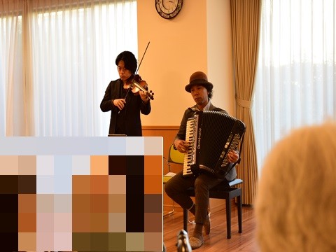 秋晴れの穏やかな午後、多くのご入居者さまが会場にお集まりくださり、笑顔と期待に包まれた雰囲気の中でスタートしました。この日は、アコーディオンとヴァイオリンの演奏者をお招きし、心温まる生演奏を披露していただきました。やさしい音色が会場いっぱいに響き渡り、秋のひとときをゆったりと楽しんでいただきました。