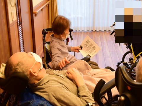 ご入居者さま一人ひとりに歌詞カードをお渡しすると、自然と口ずさむ声があちらこちらから聞こえてきます。