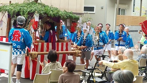 当日は太鼓の音とともに、威勢の良い掛け声が響き、施設の前まで『お神輿(おみこし)』がやってきてくださいました!施設の前に出て見学されたご入居者の皆さまは、「わぁ、すごい迫力!」「昔を思い出すわ」「元気をもらえたね」と嬉しそうな表情で、お祭りの雰囲気を楽しまれていました。