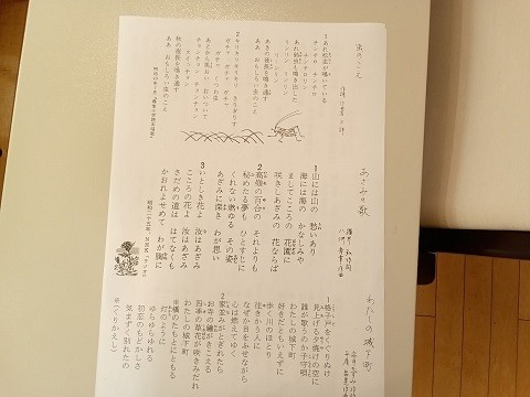 秋の歌『虫の声』や小柳ルミ子さんの『私の城下町』、懐かしの歌『月がとっても青いから』などを歌いました。