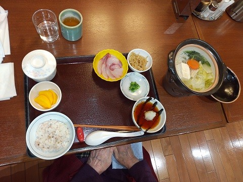 毎月、『お楽しみメニュー』として季節感にあふれたお食事を提供させていただいています。今月は、お一人さま用コンロと、先日買いそろえた『小鍋』で『ぶりしゃぶ』を楽しんでいただきました。