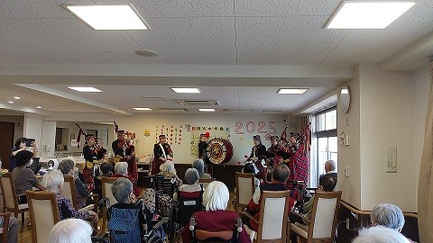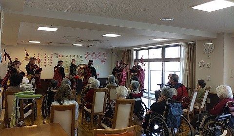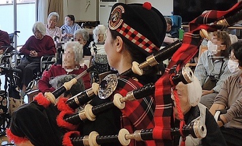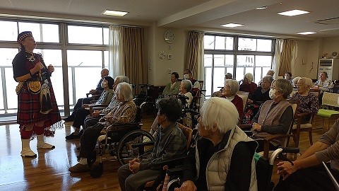 『スコットランド』の伝統楽器であるバグパイプの音色が響き渡ると、会場は一瞬で異国の雰囲気に包まれ、ご入居者の皆さまも目を輝かせながら聴き入っておられました。