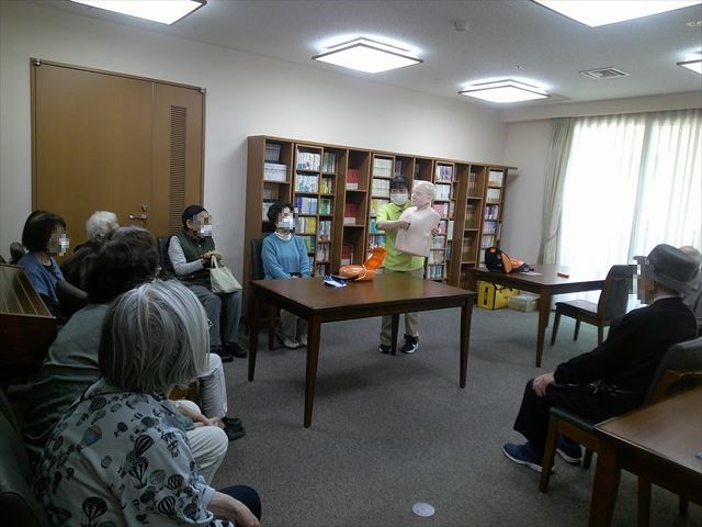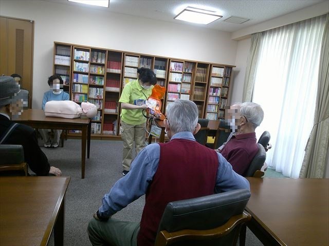 3階カルチャールームに移動し、看護師から『AED』の使用方法をご入居者さまにご説明しました。