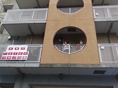 9名の方々が参加され2階の踊場より思い思いの言葉を大声で叫びます。