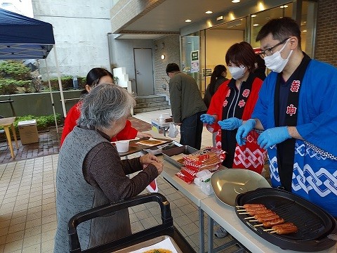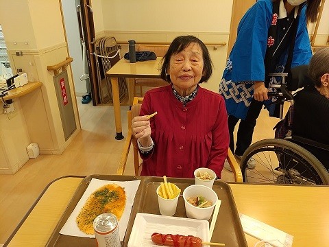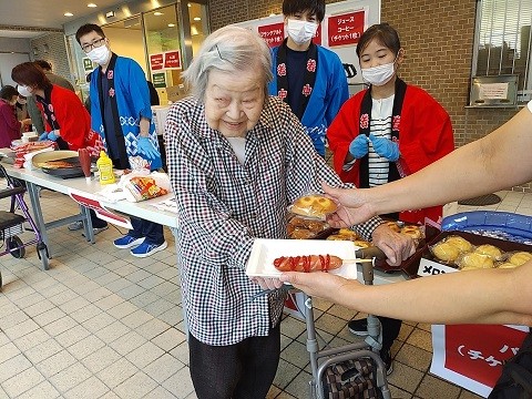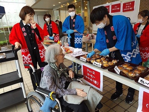 いつもご入居者さまの食事を作ってくれている厨房さんにも協力してもらい唐揚げやポテトフライ、ぜんざいも販売しました。