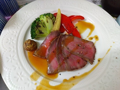 おでんやキンパ巻きもお楽しみいただきながら、メインには『国産牛サーロイン肉のタリアータ』をワインと一緒に堪能していただきました。