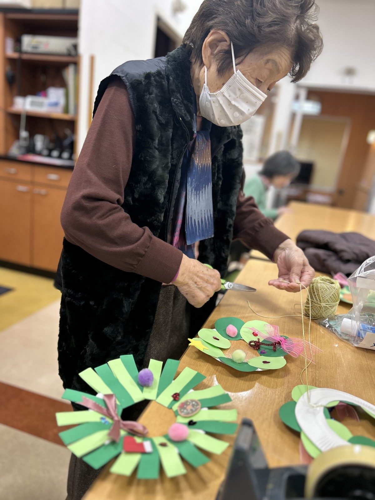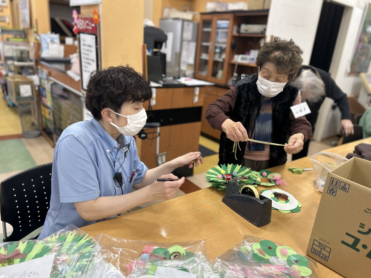 守口デイでは季節ごとに制作レクを行っています。今年の冬はクリスマスリースに挑戦!「こんなリボンもかわいいな!初めてこんなん作るわ!」と皆さま制作に夢中です!各々で可愛いデザインの制作物が完成し、クリスマスまではデイのフロアで展示していきます。その後は皆さまにプレゼントする予定です!素敵なクリスマスプレゼントになるといいな!とスタッフもワクワク♪素敵なリースが続々と完成しています!