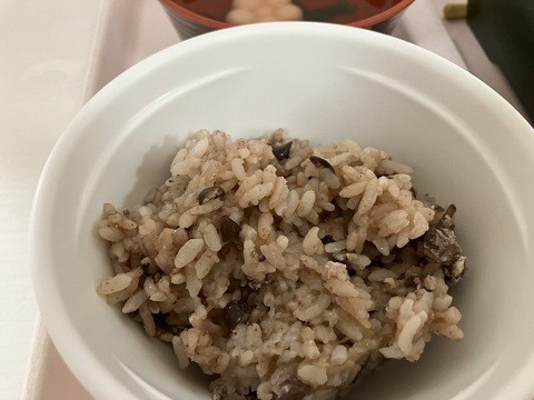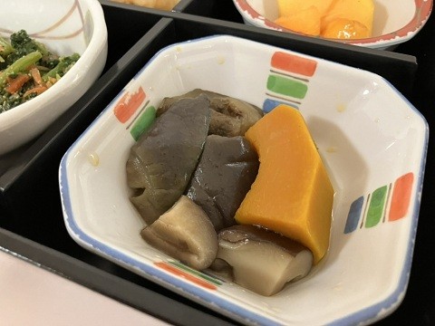 11月1日は『赤飯』『天ぷら(抹茶塩を添えて)』『カボチャとナスの煮物』『ごま和え』『清汁』『果物』のメニューです。