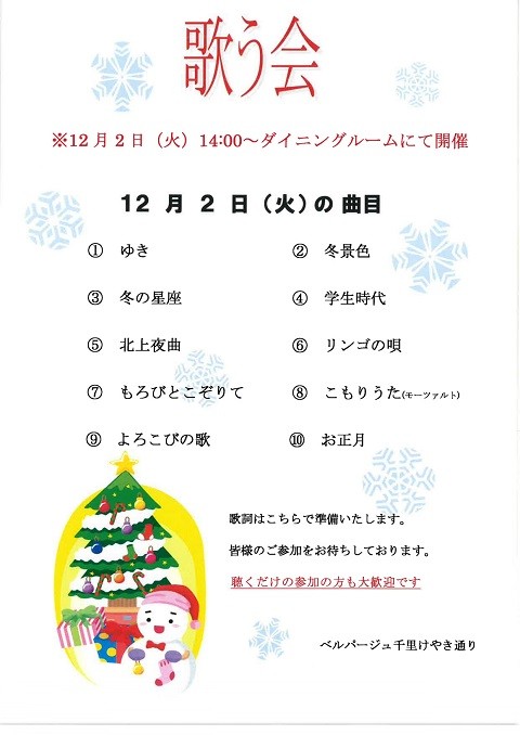 12月2日、ベルパージュ千里けやき通りでは1階ダイニングルームにて『12月の歌う会』を開催しました。