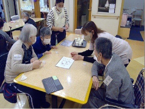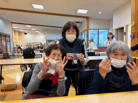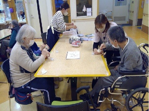 12月3日、デイサービスセンター ナービス堂山公園では『ケア美容体験会』が催されました。いつもは個別にネイルや手足のマッサージをご提供しておりますが、今回は『ハンドクリーム作り』を行いました。ネイルなどにはご興味がなかったご利用者もハンドクリーム作りなら参加したいという方もおられました。まず、初めに持ち帰り用のケースに貼るシール選びをして容器のデコレーションを行いました。