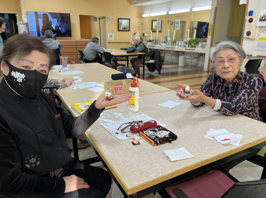 製作前にはスタッフの見本の作品をお見せしながら作り方を説明し、ご利用者さまも「分かりやすかった」「私でも作れて嬉しい」と皆さまとても喜ばれ完成した作品を嬉しそうに眺めていました。