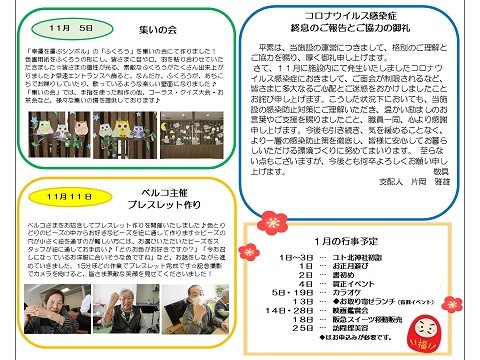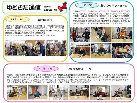 ご家族さま向けに毎月発行している『ゆときた通信』では、ホームでのイベントの様子や次月の予定を記載しております。