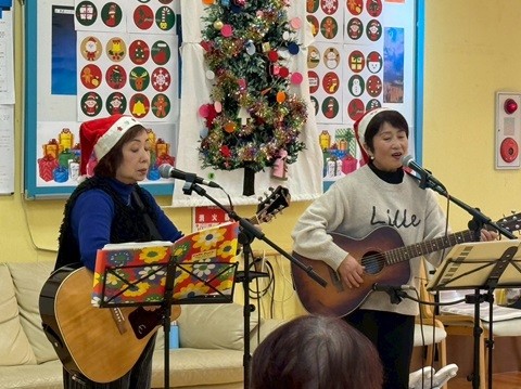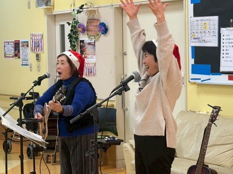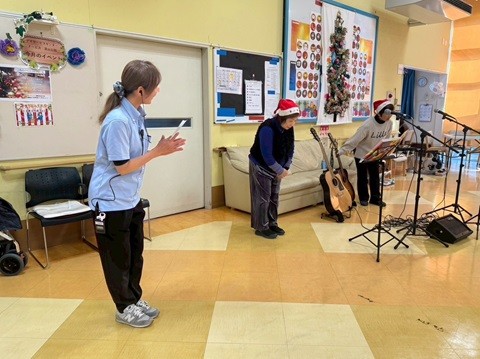 お手製の歌詞カードも配っていただき、皆で聞き覚えのある懐かしい歌や、クリスマスソングを歌詞を見ながら一緒に歌いました♪