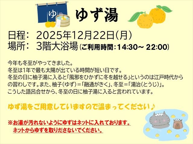『ゆず湯』で皆さまに風邪にも負けずに過ごしていただければと思います。