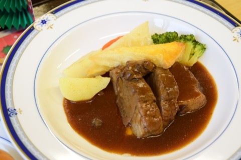 この日のメニューは、ビーフシチュー、パイと温野菜の盛り合わせ、サーモンと帆立のマリネ、コンソメスープ、パンまたはライスです。
