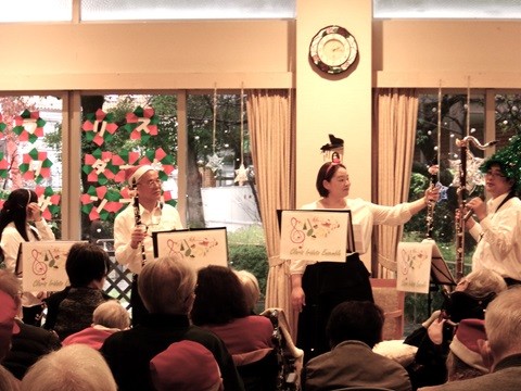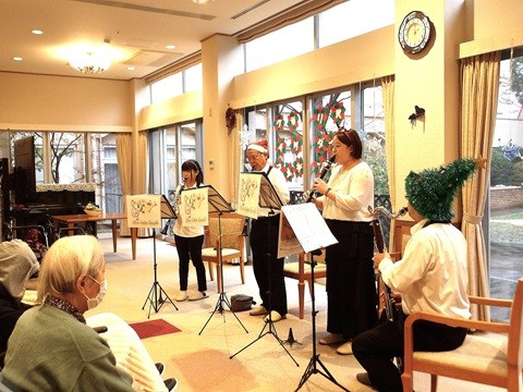 12月25日、ローズライフくずはで『クリスマス会』を開催しました。クラリス・イリダート アンサンブルの皆さまによる『クラリネットミニコンサート』が行われました。以前ご入居くださっていた方のご家族さまが演奏されました。『クリスマスメドレー』と『糸』『川の流れのように』名曲の演奏に、冗談交じりのトークも最高でした。おやつの時間にシャンメリーで乾杯! お食事はクリスマスメニュー!ご家族様からのクリスマスプレゼントも届きました。「皆さまでどうぞ」「大きなケーキね」と目を細めておられました。