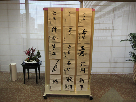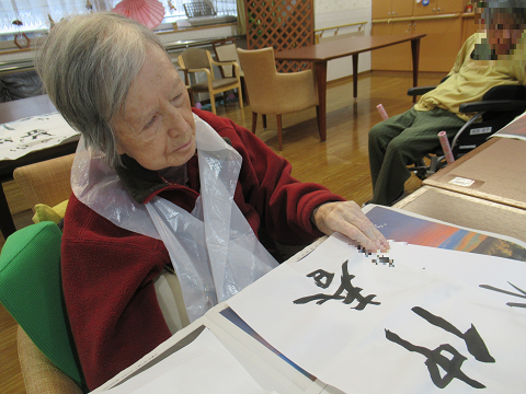 気に入ったお手本を選ばれ、ひと筆ひと筆ていねいに書かれました。「筆を持つのは久しぶり、緊張するね!」「お手本たくさんあって悩むね!お正月らしいこれを書いてみようかな♪」と久しぶりの書初めに笑顔で話されました。出来上がった書初めはフロント前にて掲示させていただきました。