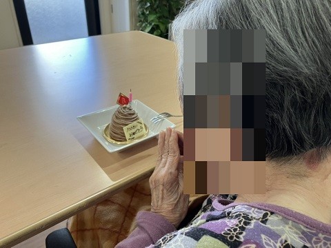 ベッドでお休みでしたが、お声がけさせていただき、談話室までお越しいただきました。事前にお伝えしていませんでしたので、「何かあるの?」と仰っておられたのですが、スタッフのバースデーソング♪で笑顔になられました。