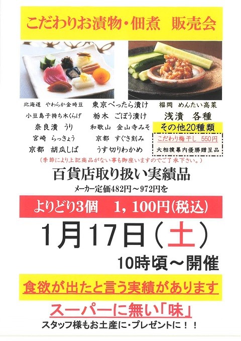 1月17日、ベルパージュ千里けやき通りでは『美味匠庵さまの漬物・佃煮販売会』を開催いたしました。