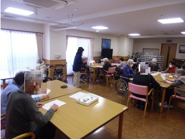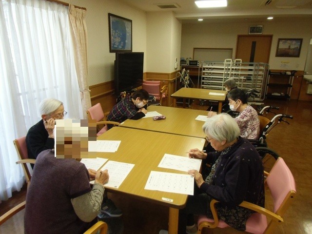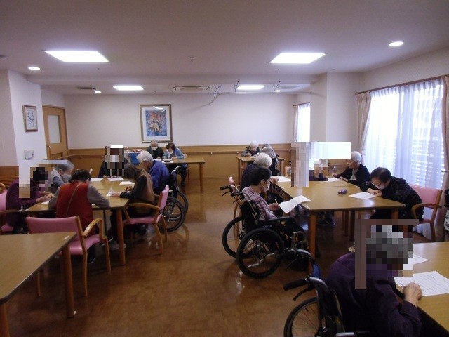 「今月はどんな問題かな~」「今日は少し簡単やったわ!!」と・・・計算、ひらがなクロスワード、文字の並べかえ等々にチャレンジ♪順番に答えていただき、20分ぐらいで完成され全問正解の方もおられました。