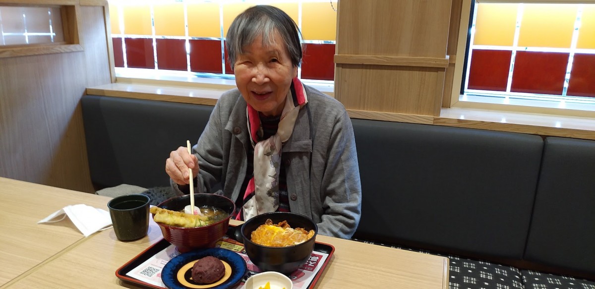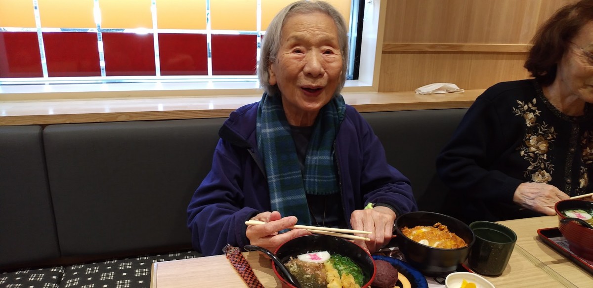 「うどんやさんで、ぼた餅たべるの?」とご入居者さまは不思議そうにされていましたが、ぼた餅を一口いただくと、「納得!うどんやさんで、ぼた餅もいいね!おいしい♪」との感想でした♪
