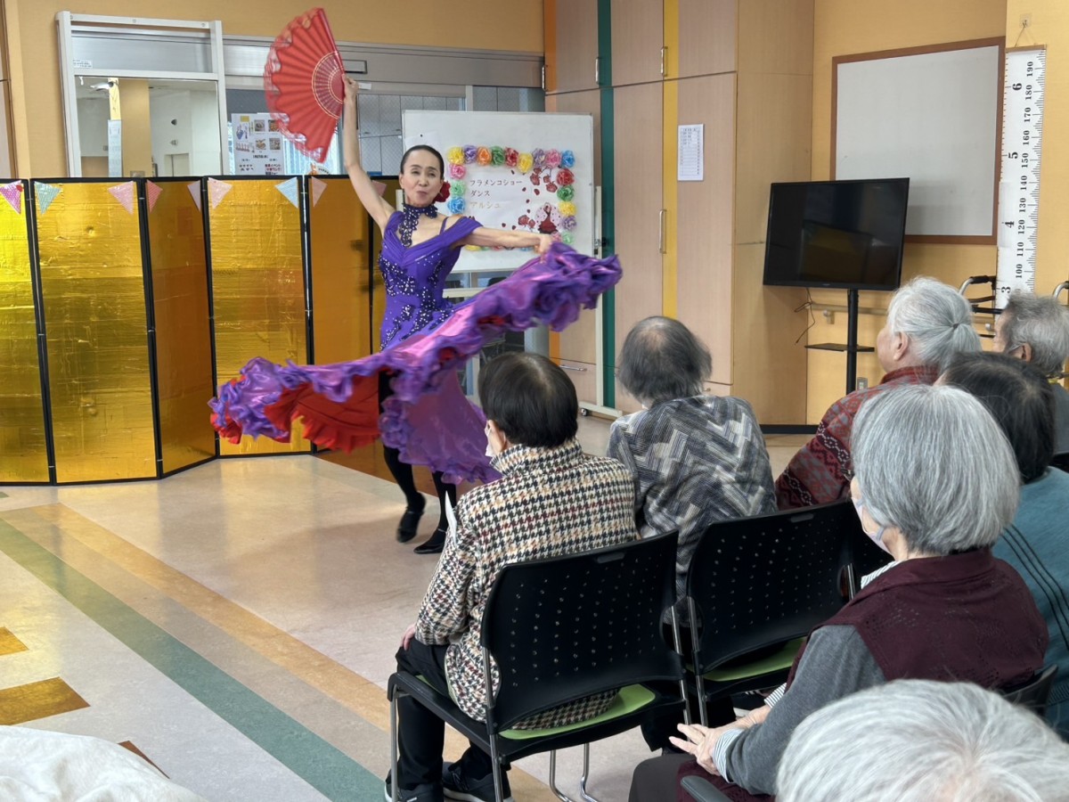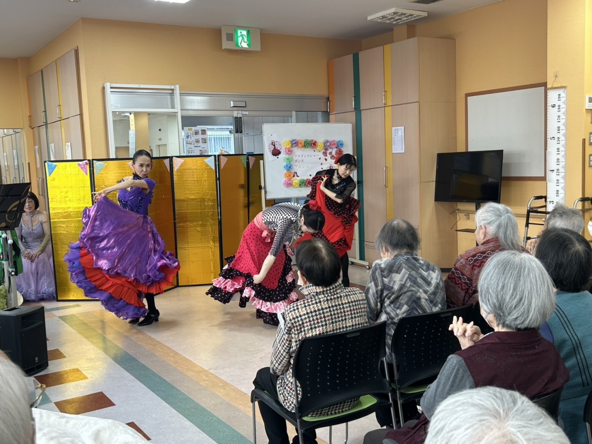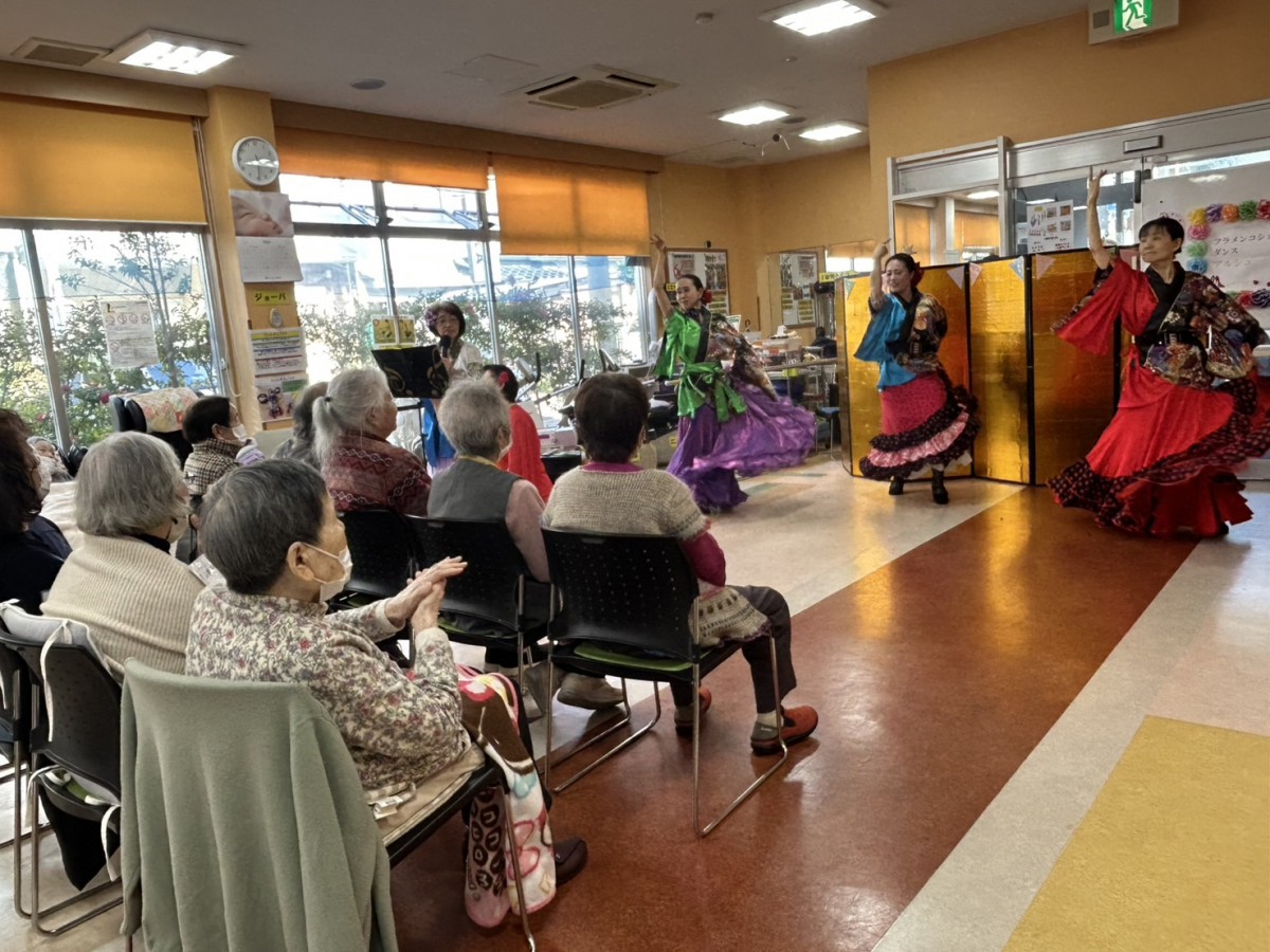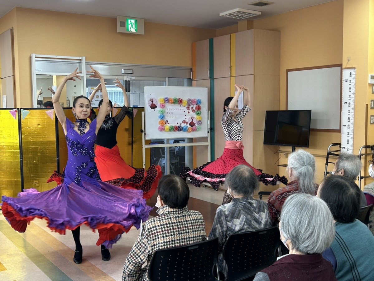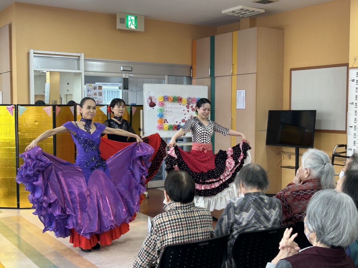 1月18日、デイサービスセンターナービス守口では『アルシュ』という、フラメンコダンスの教室をされている方々がボランティアとしてお越し下さいました。