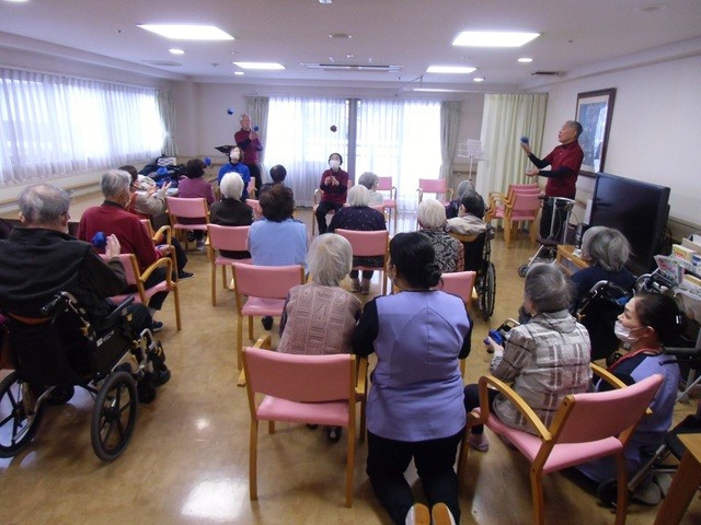 「エイエイオー」の掛け声でスタートです!チューブ体操にお手玉、全身運動。体も温まり、皆さまでふじの山・スキーと、フルートとウクレレの伴奏で合唱しました。「今日も楽しかったわ!ありがとう。」「また待ってるね」と楽しい時間をお過ごしになられました。