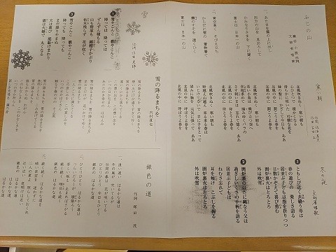 本日の歌は『雪』『銀色の道』『富士の山』『寒い朝』『冬の夜』『雪の降る街を』 です。