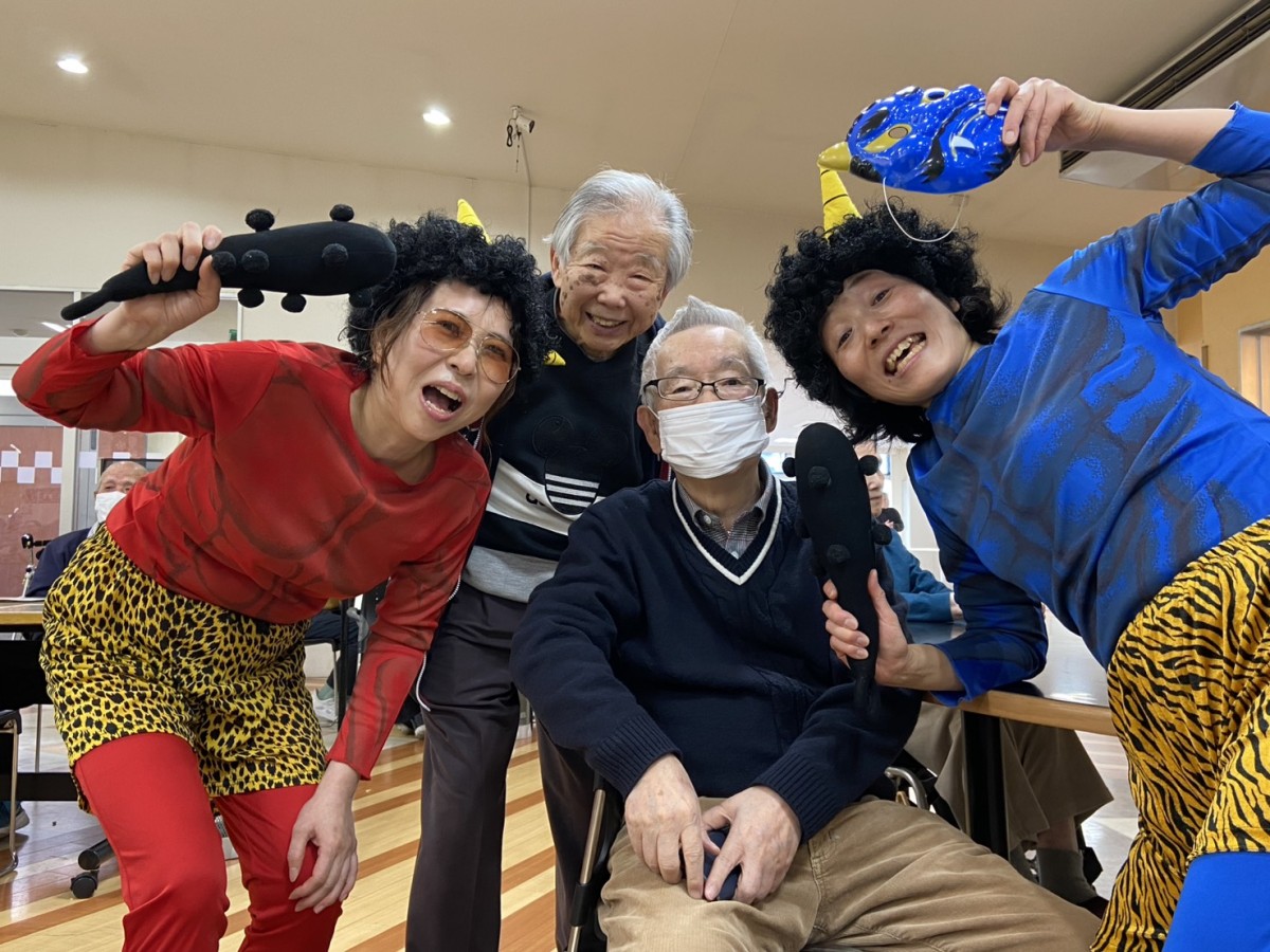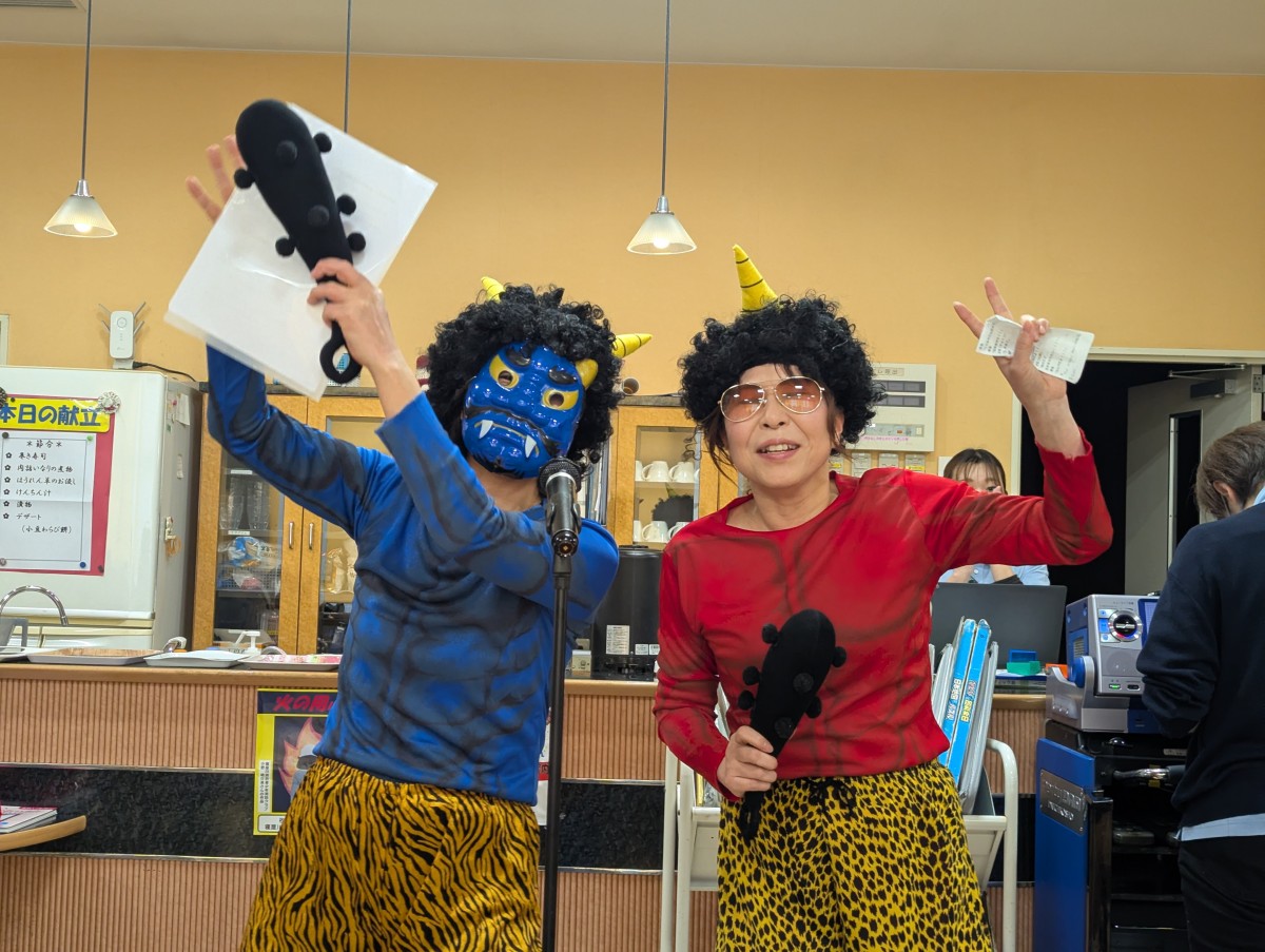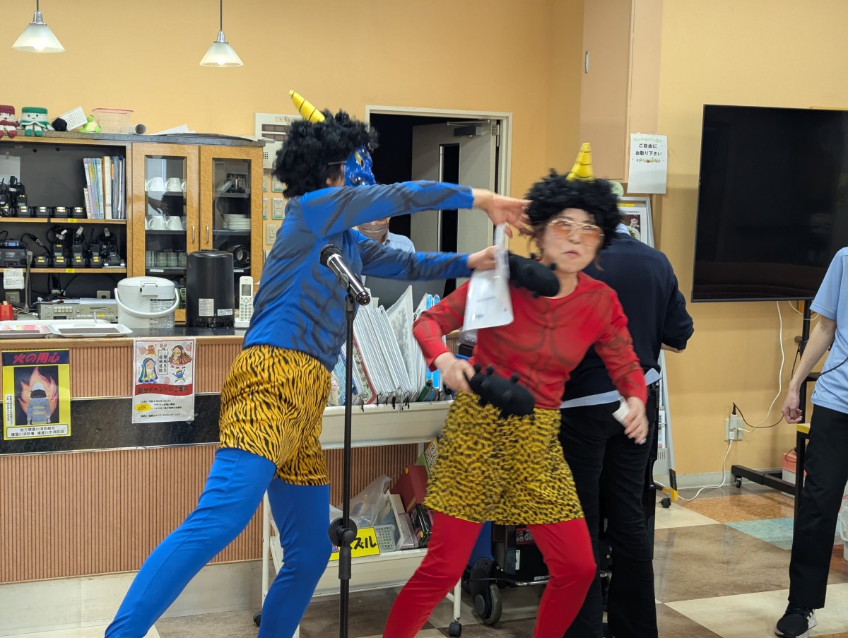 当日は、スタッフが赤鬼・青鬼に扮してフロアに登場し、利用者の皆さまからは驚きと笑い声が上がりました。豆まきの前には、節分にちなんだクイズを実施し、「節分にはどんな意味があるでしょう?」などの質問に、皆さま真剣に考えながらも楽しそうに参加されていました。