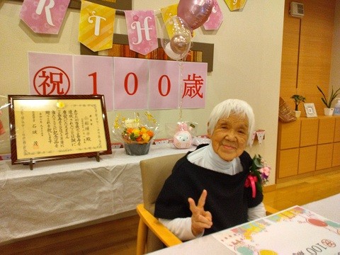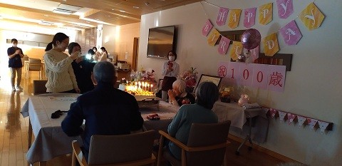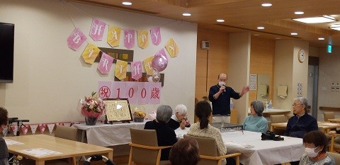 百歳を迎えられたご入居者さまは、少し照れながらも終始にこやかな様子で、その笑顔に周囲も自然と笑顔になりました。