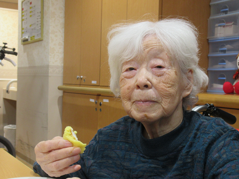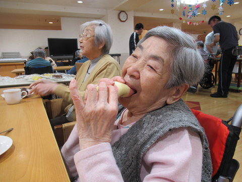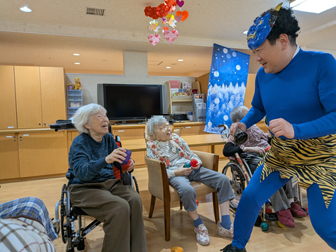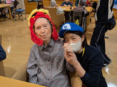 今日は節分の日、『豆まき』を行いました。青鬼と赤鬼の登場に歓声があがり、スタッフから渡されたボールで「鬼は~外♪福は~内♪」と掛け声をかけながら鬼退治!豆まきを楽しまれました。福を呼び込んだ後は、恵方巻風ロールケーキをかぶり付きで食べていただきました。「楽しかった~♪ケーキも美味しい!」とあふれる笑顔でお話されました。