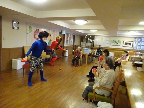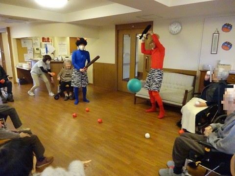 サポートセンターのご入居者の皆さまは『豆』の代わりにボールを鬼にぶつけて鬼退治です。