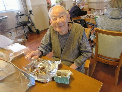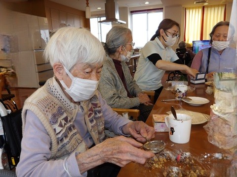 2月8日、『バレンタインイベント』の『手作りチョコレート』を行いました。ローズライフくずはでは恒例となっています。今年はグラノーラシリアルを使用しシンプルですがちょっとした『コツ』が必要で、皆さま真剣に取り組まれていました。「これがチョコレートになるの?」「これでいいの?」と半信半疑でしたがあっという間に仕上がり、満足そうな表情をされていました。